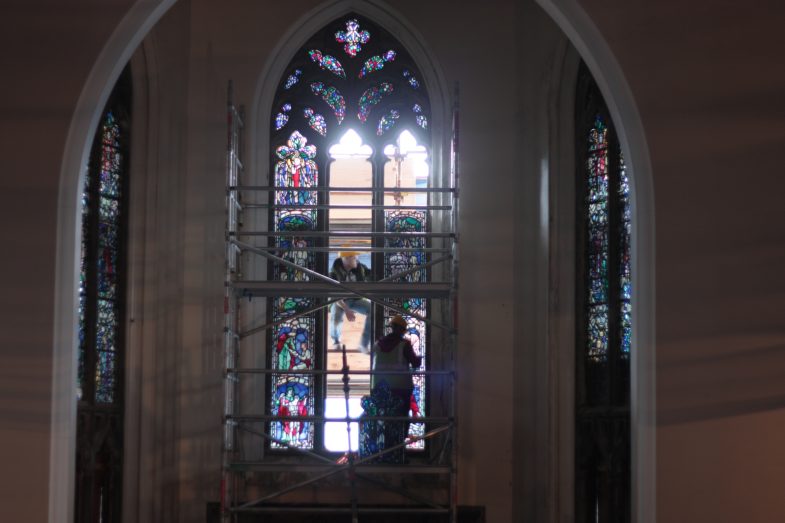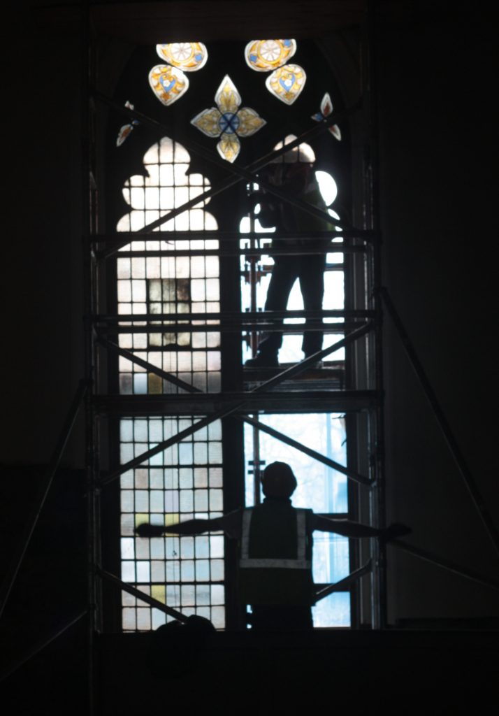 Also as that job is finished now here is a wee slide show of various photos I took since January in no order really. We cut up around 4000 rectangles, rebuilt 2 vandalized windows, restored a large 3-lancet window, didn’t fall off anything & nothing fell on us. Mission success!