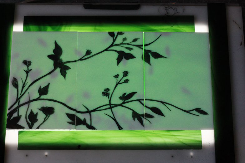 In my last batch of work, I was experimenting with layering glass with painting on both layers to create a shadow and ghost-like appearance. This week I wanted to try to plan a little more how the layers would look, instead of pairing up unintended sections. Although leaving the painting to chance creates its own beauty I thought I’d try plotting how the finished item would look.